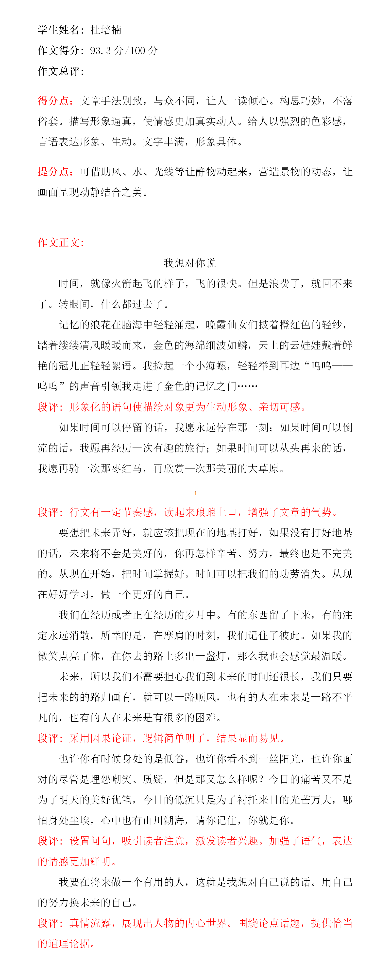 在日常的生活学习中,郝培凤是一个喜爱读书,勤于写作的好孩子。本篇习作采用书信体格式,突出了中心思想。回首过往,总结不足;把握当下,勇往直前;展望未来,表达期望。文章构思巧妙,语言清丽,希望再接再厉。