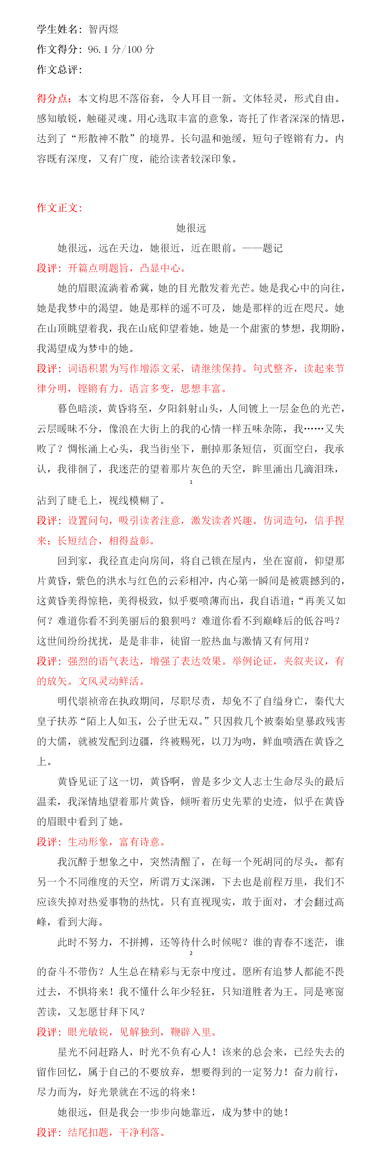 当我看到《她很远》这个题目时,我思绪万千,跟随着心底的记忆来到那次仰望黄昏的日落时分,想要借美得惊艳极致而耐人寻味的黄昏给遭受挫折的自己一份信心,一份肯定,一份期许,来勉励自己放眼未来,追求人生理想,心怀希望与热忱,一步步靠近梦想中的她!