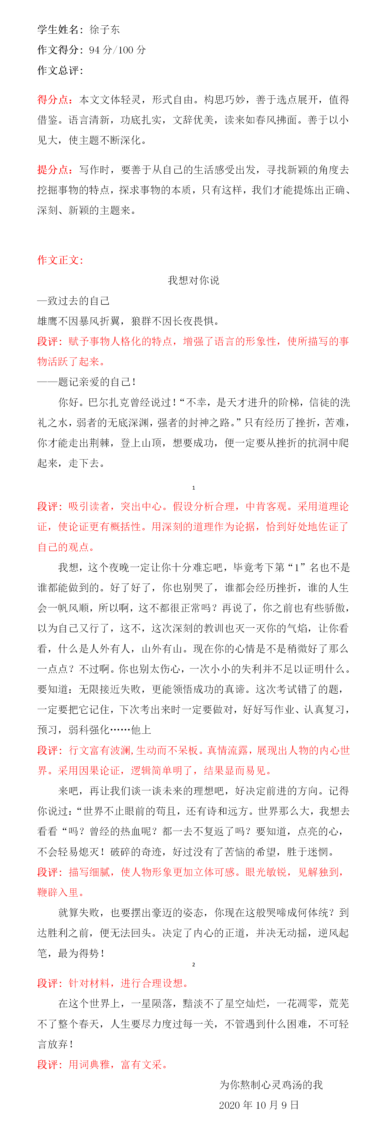 今天,你在创新作文平台崭露头角,取得了可喜的进步,老师给你鼓掌!但你一定要记住,写作之路还很长很长,老师希望你在成绩和荣誉面前,戒骄戒躁,稳扎稳打,拥抱更加辉煌灿烂的明天!