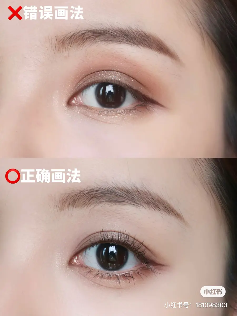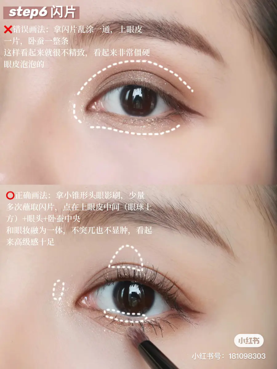 4️⃣闪片不要从头到尾铺满,只需要在眼皮中央,卧蚕中央、眼头轻轻点缀即可,不然很显廉价!