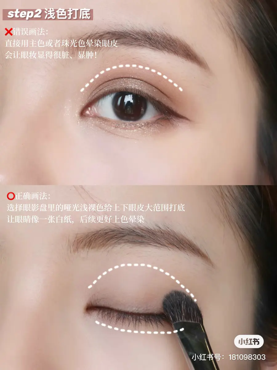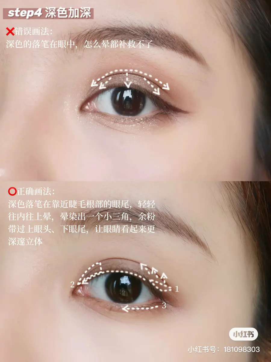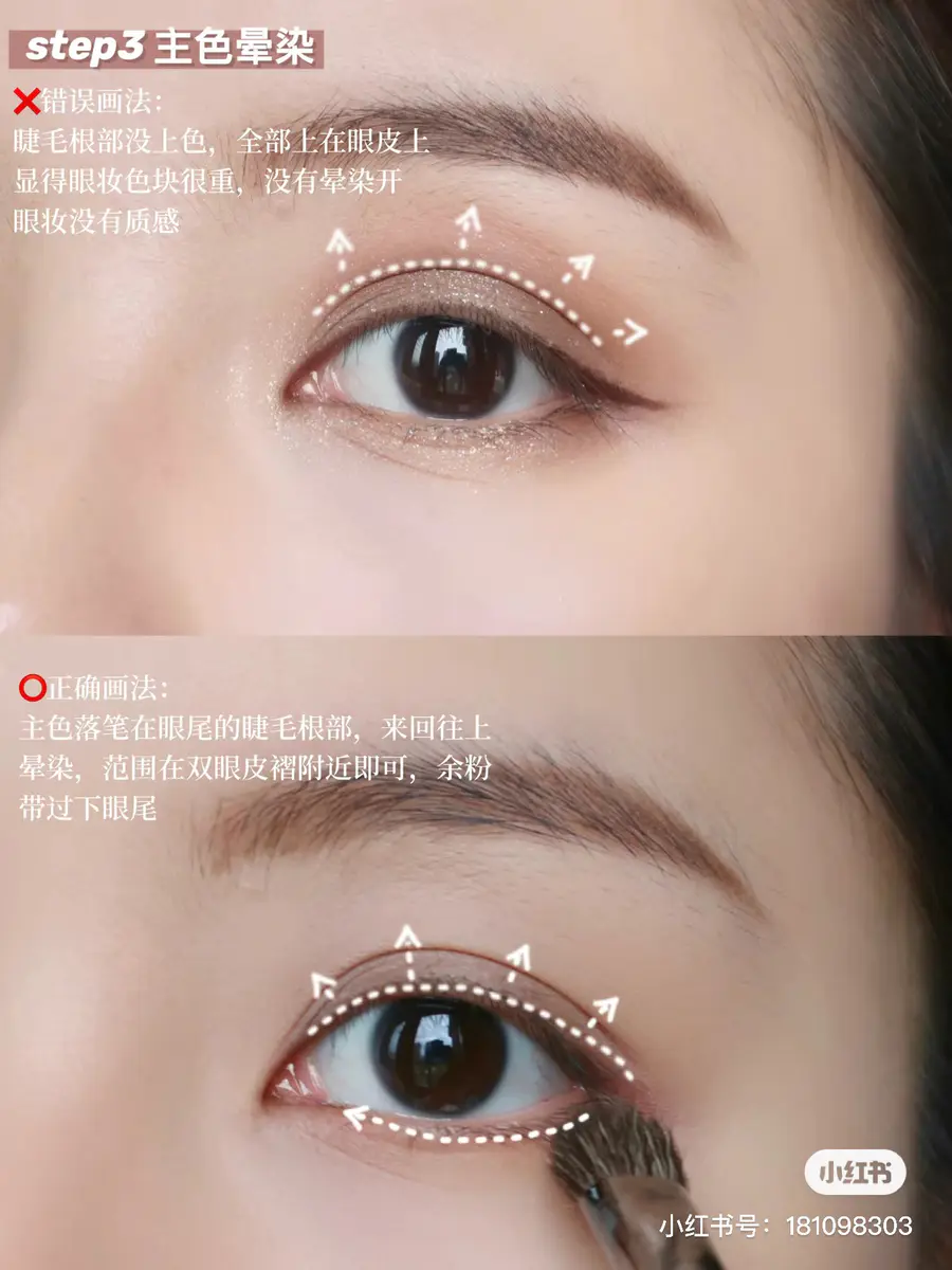 3️⃣注意主色、加深色落笔都在眼尾靠近睫毛根部,不要在眼皮上直接晕染