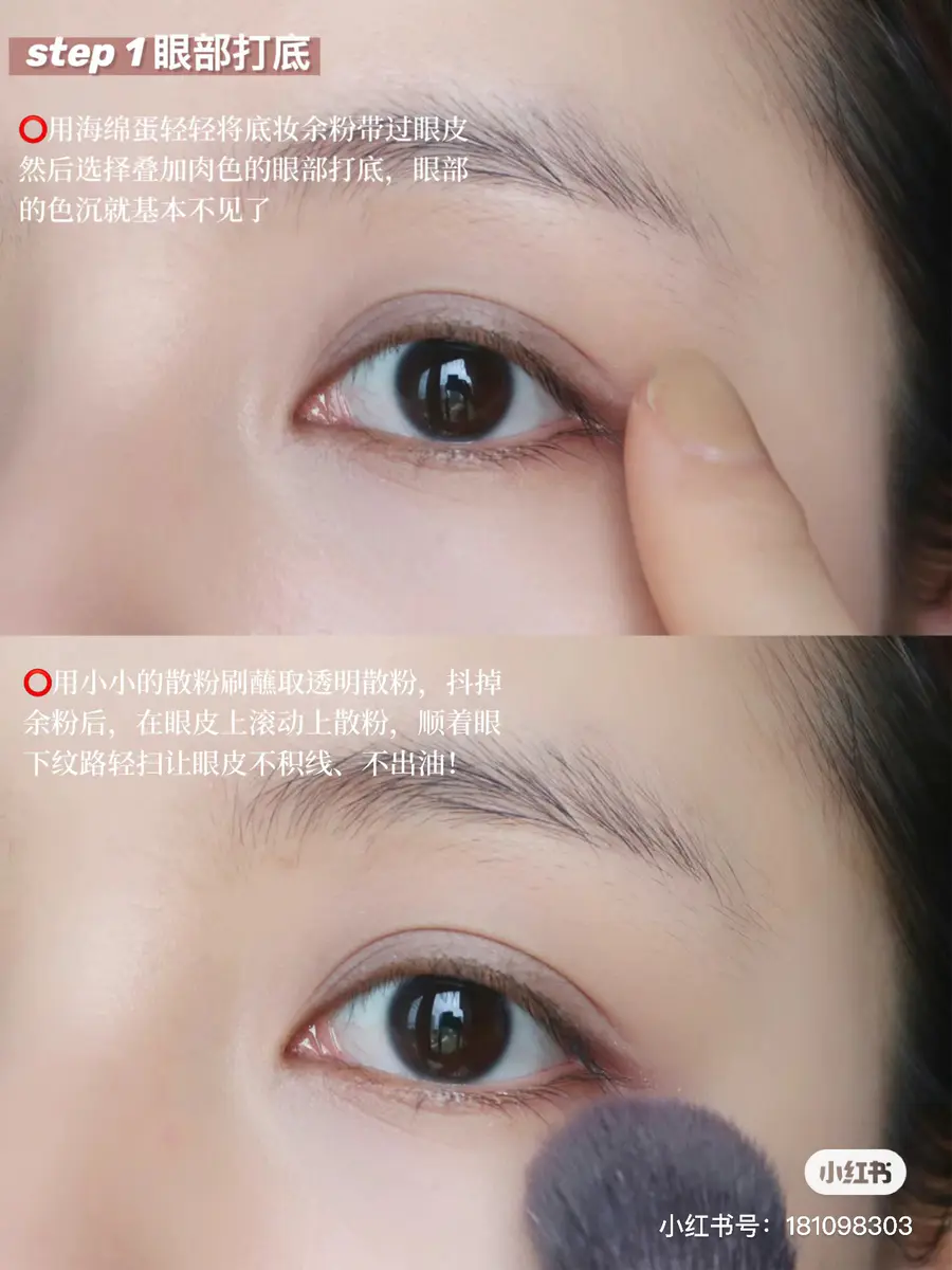 1️⃣注意眼妆前给眼皮打底+散粉滚动定妆