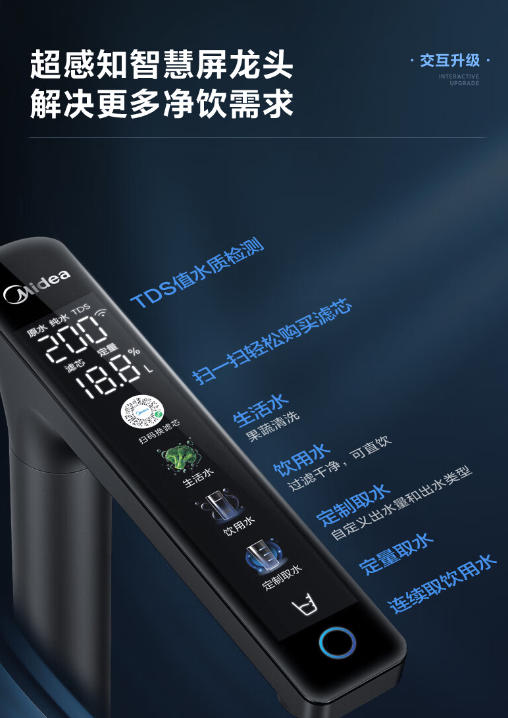 这里比较推荐的是美的(Midea)净水器白泽1000G pro这款🌟,基本满足了大家的日常需求,智慧屏龙头,大容量,双出水,ro滤芯,0陈水,3:1的废水比,省水更省心。