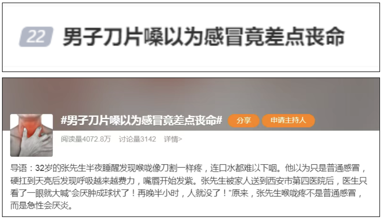 前段就有个热搜——#男子刀片嗓以为感冒竟差点丧命