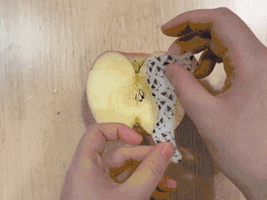 在苹果的一边贴上眼膜,然后放进微波炉加热,让水分蒸发以及红外线氧化。
