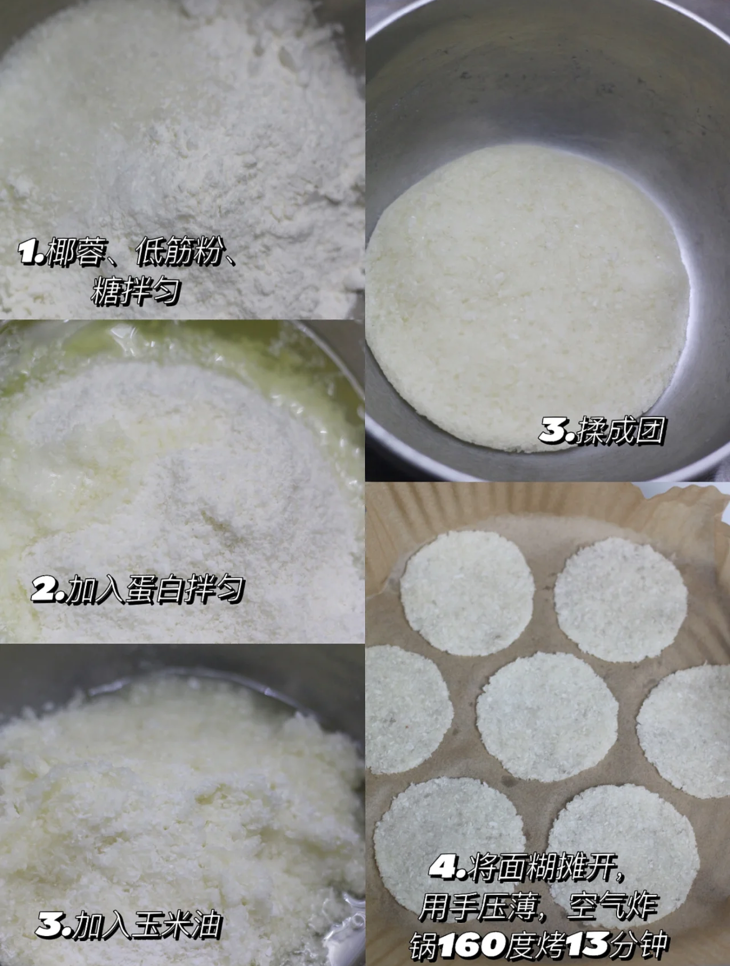 1、将椰蓉、低筋面粉、白砂糖拌匀。然后倒入蛋白继续拌匀