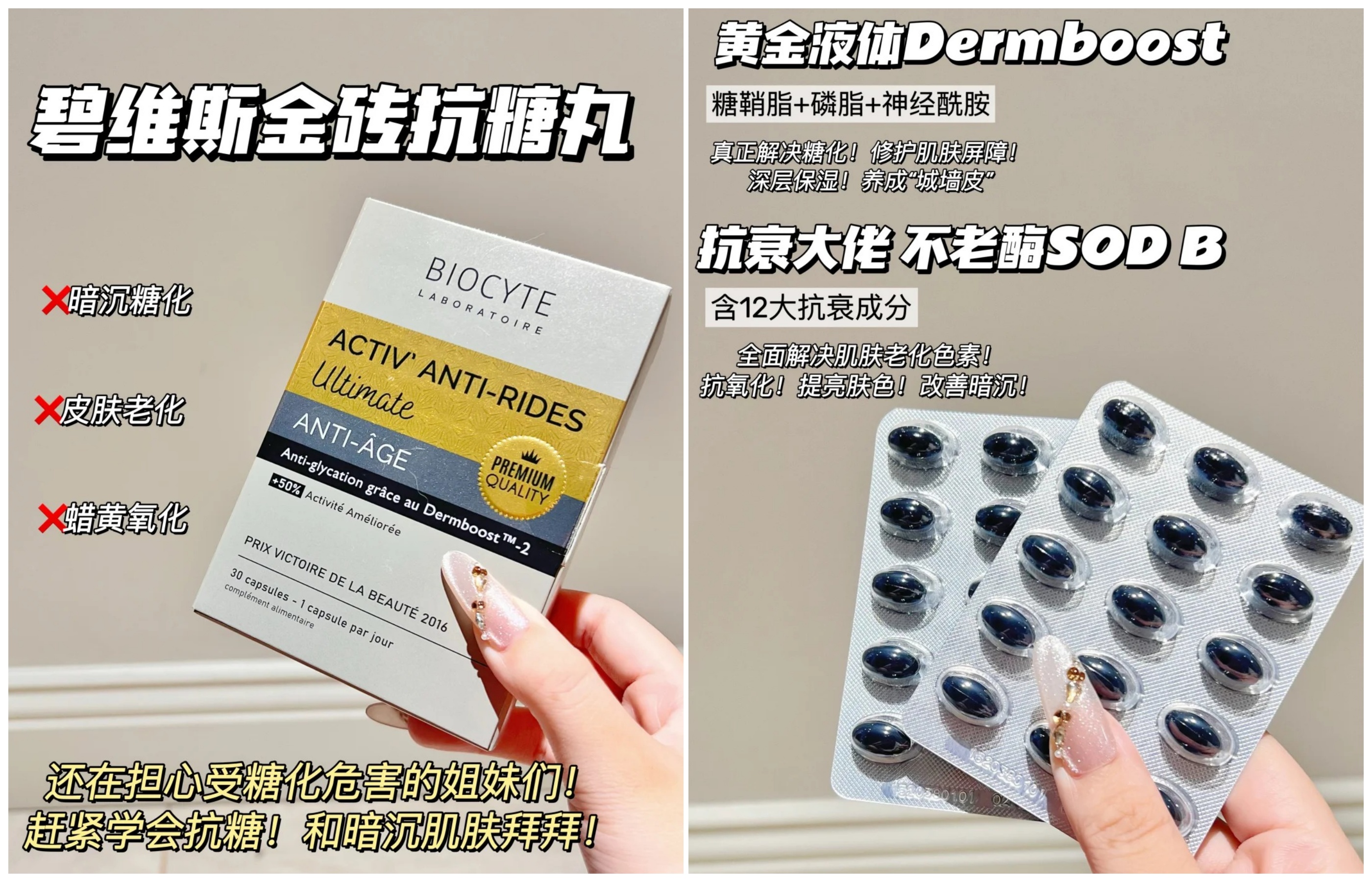 【BIOCYTE抗糖丸】 则是日常抗老的坚实后盾,抗糖+抗氧+抗光老,全方位延缓肌肤老化,提升肌肤整体健康度。