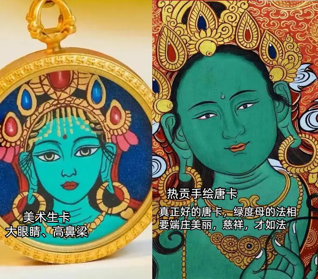 真正的传统唐卡(图右),绿度母法相要端正、慈祥,才如法。