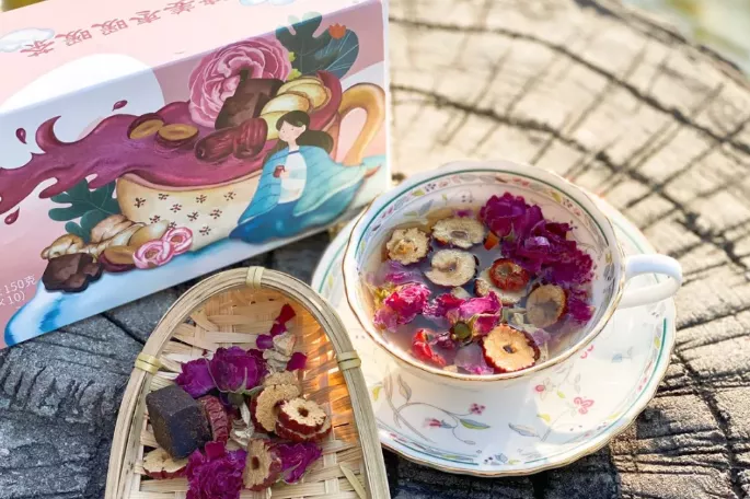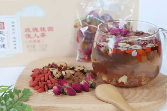 「玫瑰桂圆佳人茶」精选玫瑰花、红枣片、人参片、桂圆、枸杞五种道地药食原材料,具有疏肝解郁、美白祛黄、滋补气血等功效。