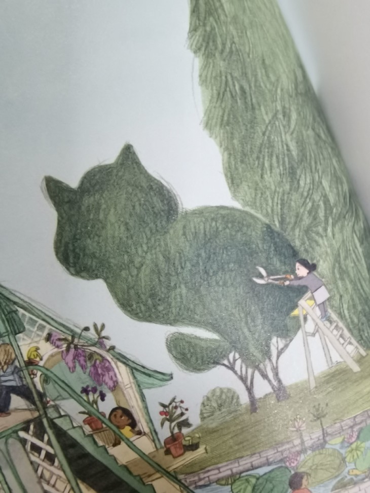 这本书的彩蛋真是多,我们居然发现了猫咪形状的树,这看起来很惊喜,想想绘者还真是有一丝丝的调皮,还有👽也出现了,窗外还有一个不知名的东西,兄弟俩对它充满了好奇。