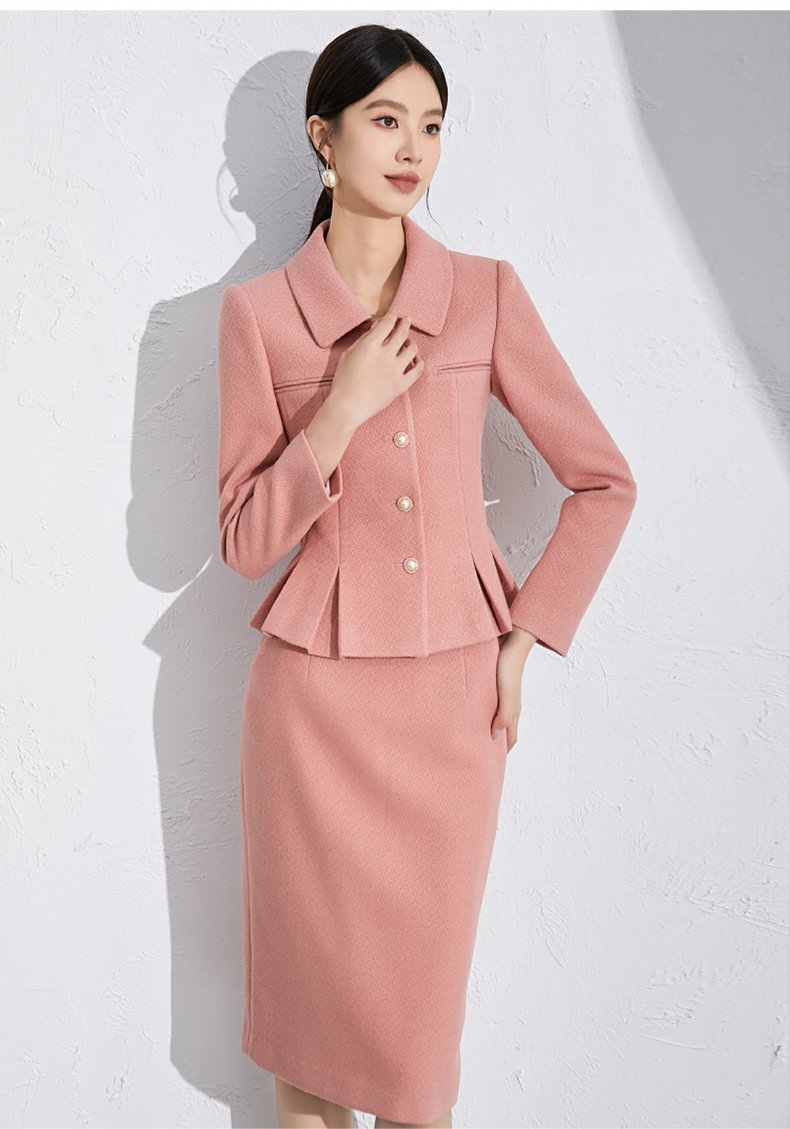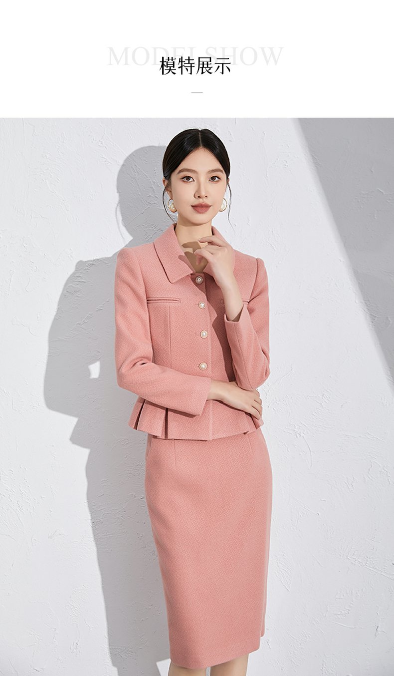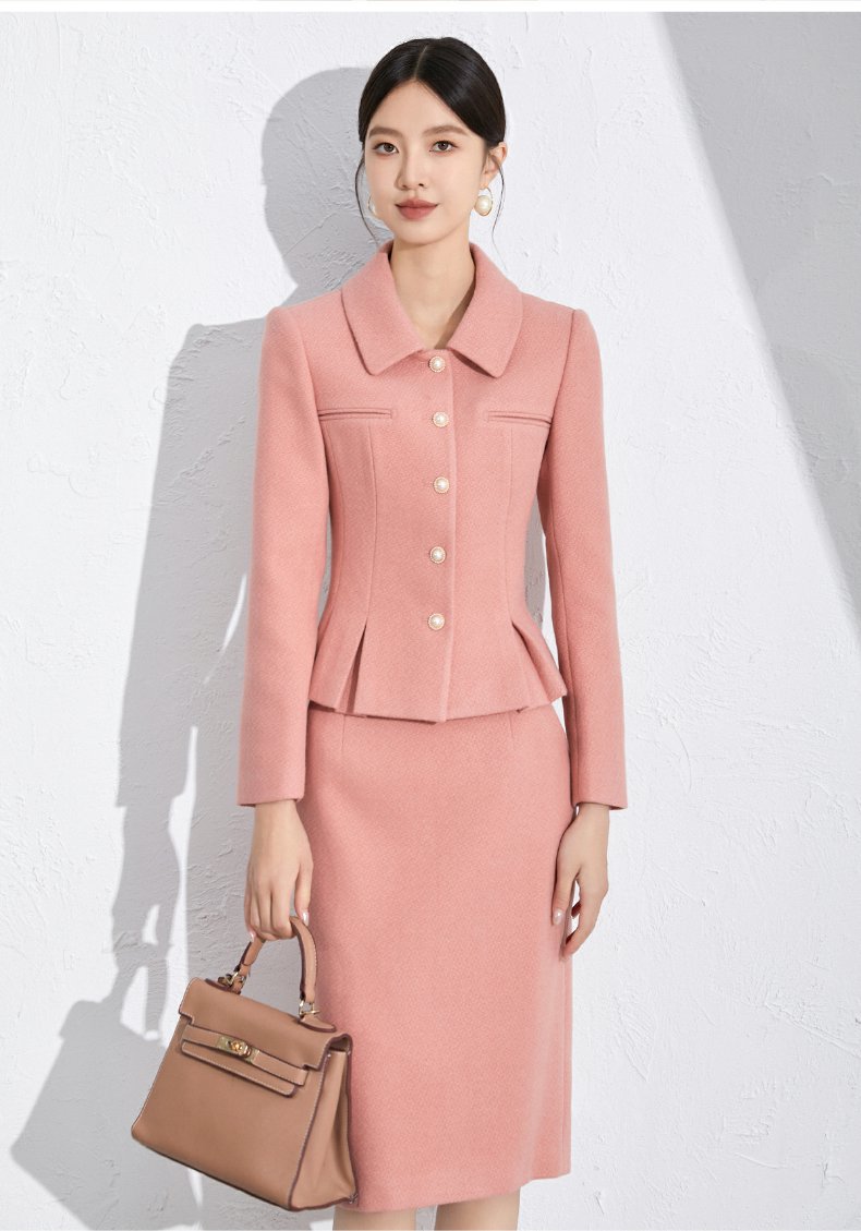 这款玫瑰粉西装套裙,是职场里的 “温柔武器”。粗花呢面料自带秋冬的温暖质感,珍珠纽扣与娃娃领碰撞出法式慵懒,收腰 + 鱼尾摆的设计悄悄勾勒腰线,把干练和柔美揉得刚好。
