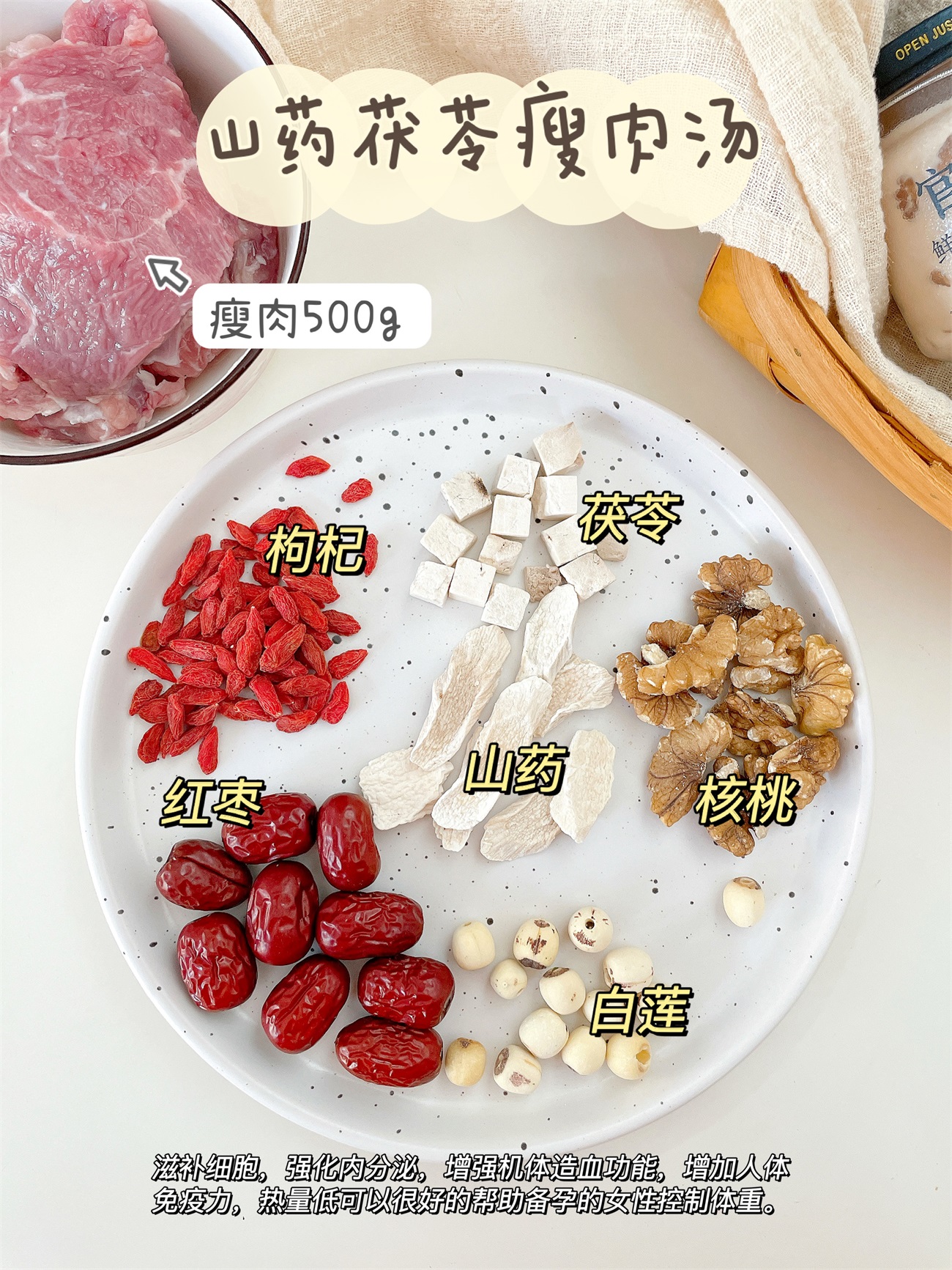 🛒食材:山药、茯苓、枸杞、白莲、核桃仁、红枣、瘦肉500g
