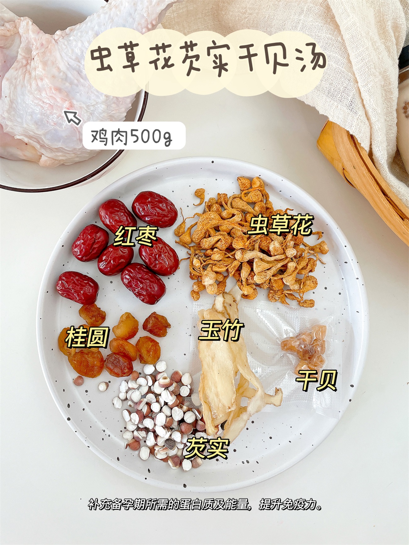 🛒食材:虫草花、玉竹、芡实、干贝、红枣、桂圆、鸡肉500g