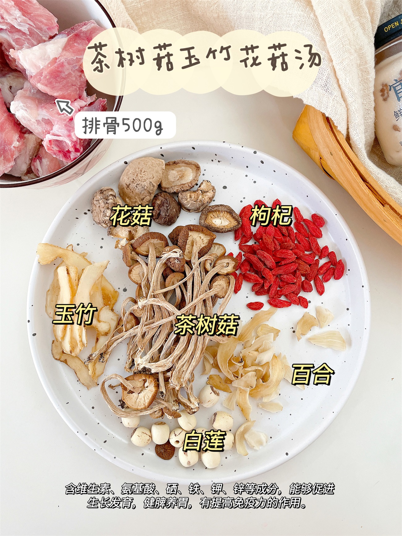🛒食材:茶树菇、花菇、白莲、玉竹、枸杞、百合、排骨500g