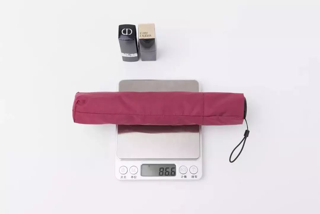 这把伞是富尔顿2019年新升级防晒伞,独特之一就是非常的轻,可以说是颠覆性的轻。到底有多轻呢?它包含伞套,也仅仅只有86.6g!相当于两只口红的重量。
