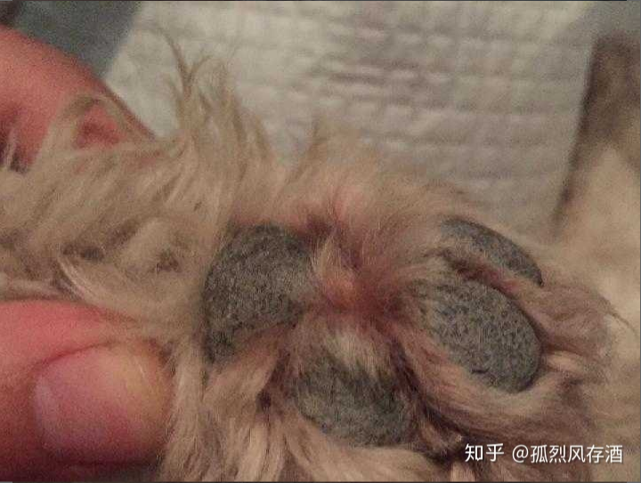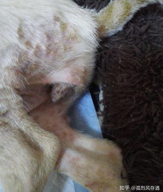 腹部、后肢内侧出现米粒大小红色(小鼓包)丘疹或水泡、鼻子干燥、龟裂、脚垫增厚粗糙。
