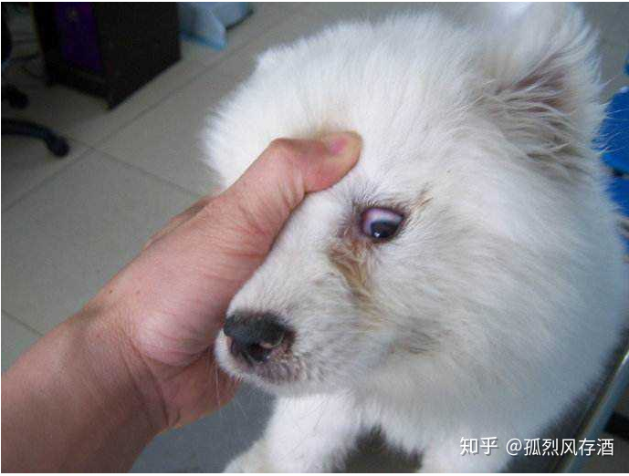 患犬出现结膜炎与角膜炎,表现为:眼部红肿,眼泪增多、上下眼睑被泪液浸湿成流泪状。