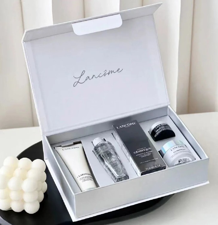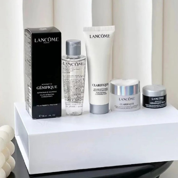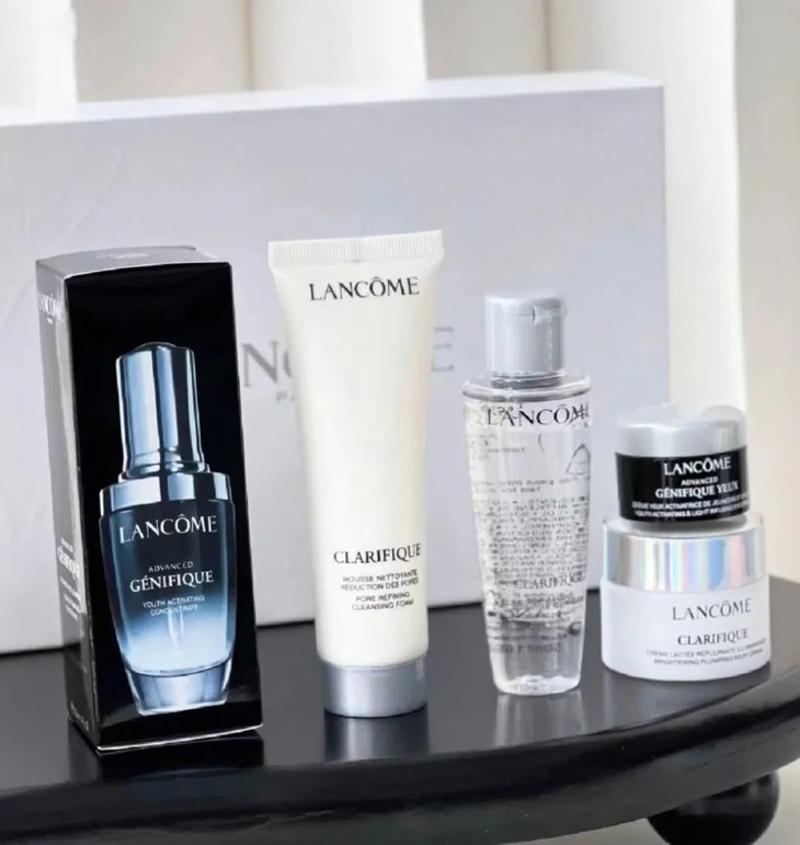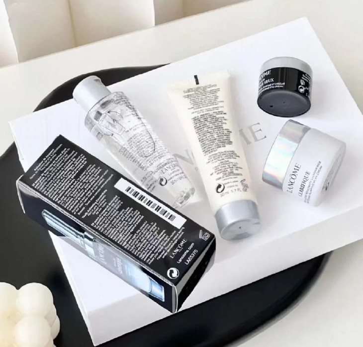 一套【兰蔻全明星护肤礼盒】中含有:发光眼霜+极光洁面乳+极光精华水+小黑瓶精华+极光亮白霜,随便单拎一个出来都要200元+!