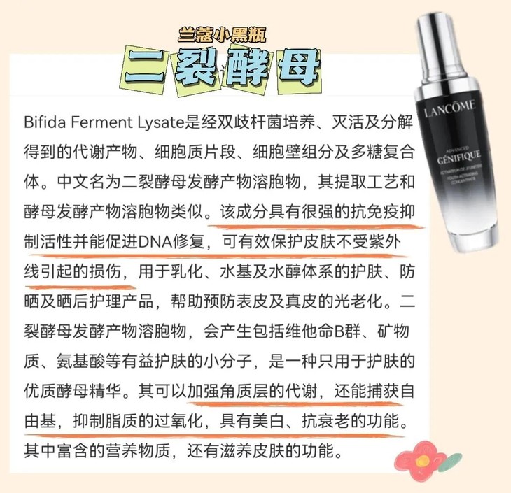 小黑瓶中含有二裂酵母,它的主要作用就是减少皮肤干燥程度,降低敏感性,加强皮肤屏障抵抗力。