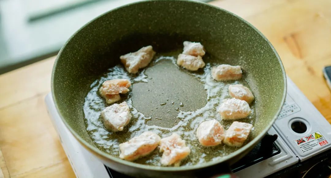 锅里倒油,油热后放入鸡胸肉块,半煎半炸将鸡胸肉炸熟,每面大约2分钟。
