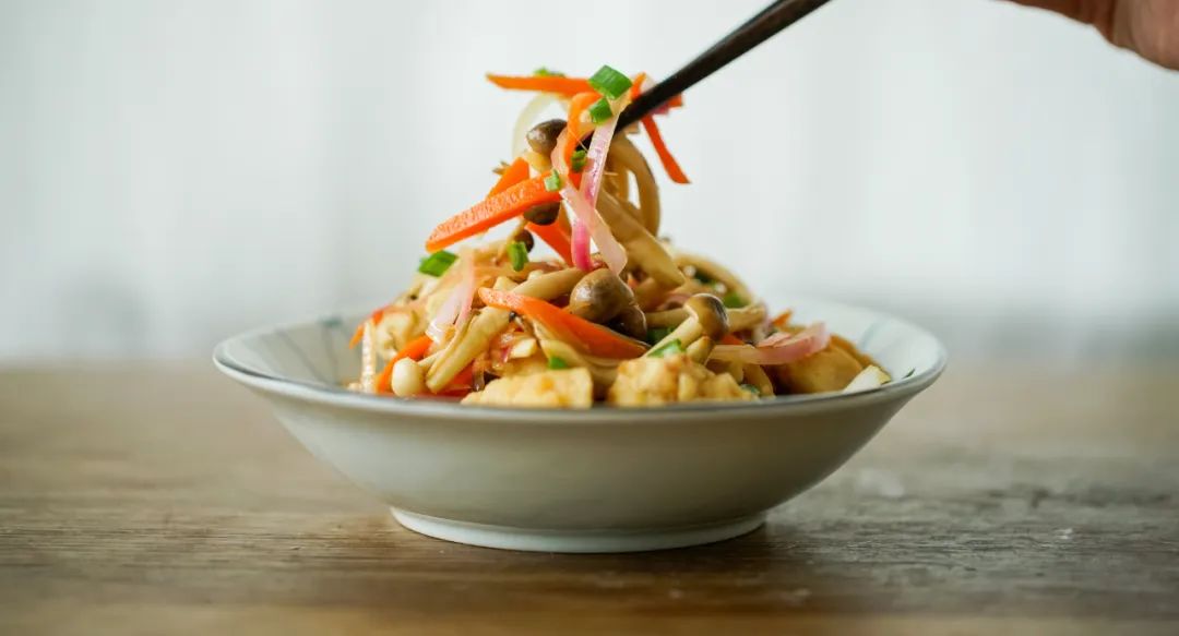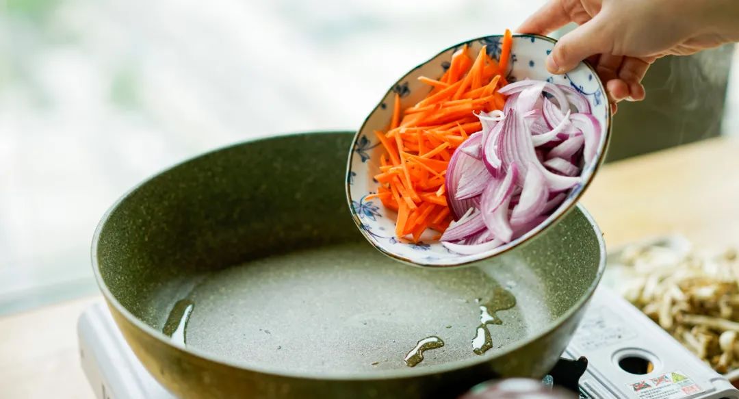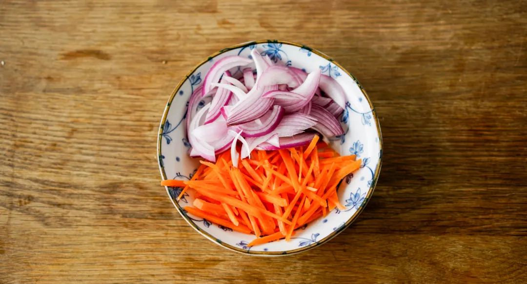 ▼ 1.处理食材:洋葱切丝,胡萝卜切丝,菌菇切成小朵。