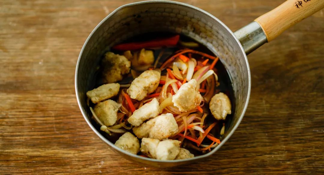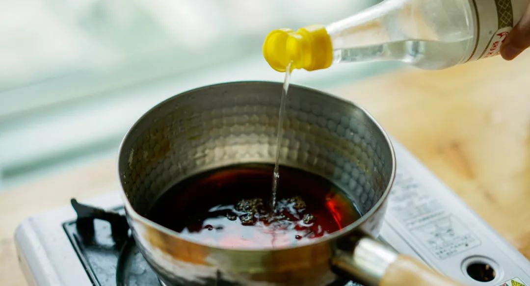▼ 5.调制酱汁:锅中加入水、米醋、酱油、清酒、味淋、糖、辣椒。