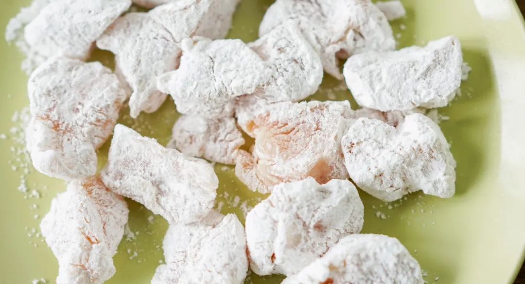 ▼ 4.炸鸡块:腌制好的鸡胸肉沾上淀粉,拍掉余粉,等待返潮。