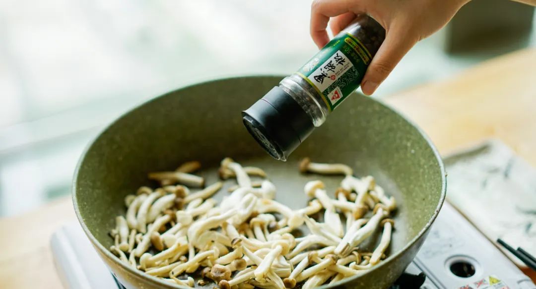 等到发出吱吱的声音时,用筷子翻炒一下,撒盐和黑胡椒,炒至出水取出。
