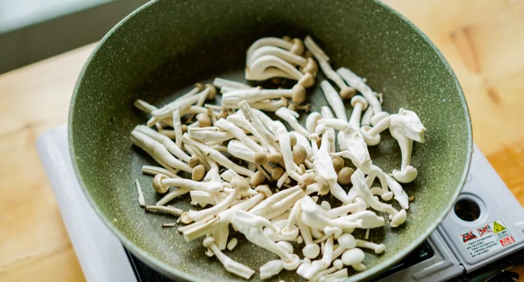 ▼ 3.翻炒蔬菜:平底锅不放油,放入菌菇,中火慢慢干煸。
