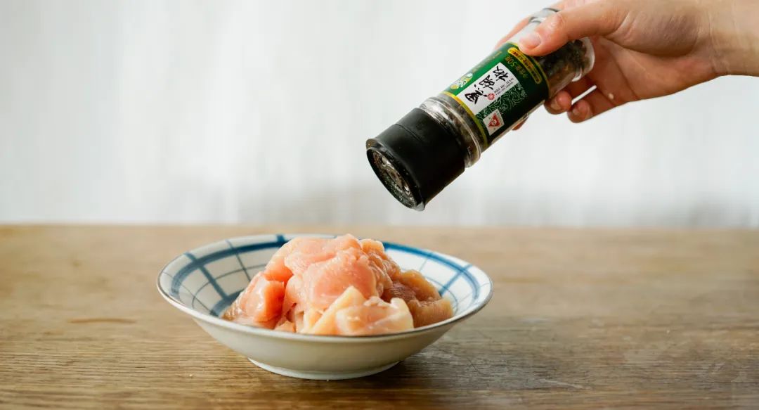 ▼ 2.腌制鸡肉:鸡肉块撒盐和黑胡椒、一点蒜末,拌匀后腌制一会。