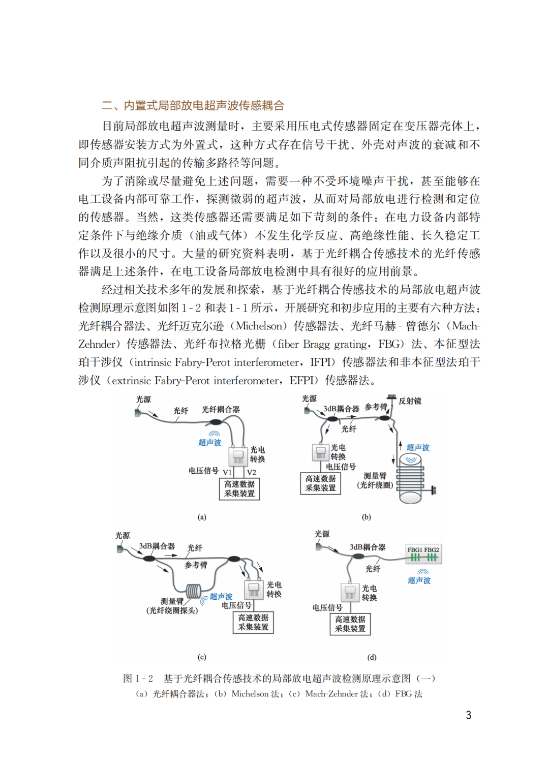 本书首先对国内外在用和在研的AE法、UHF法变压器局部放电测量方法及相关传感器技术进行了全面回顾,分析了内置式AE法传感器以及将AE法传感器和UHF法传感器进行一体化综合设计、研制、试验和工程应用的巨大必要性和技术可能性,在此基础上详细介绍了EFPI光纤AE传感器以及与油阀接入式UHF传感器相结合的设计研制思路。