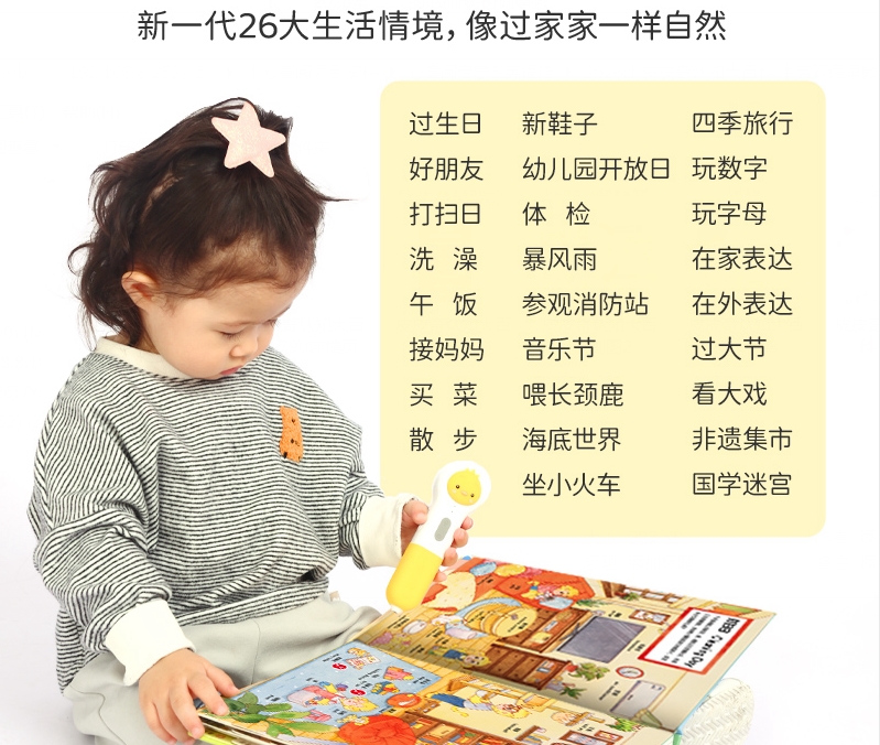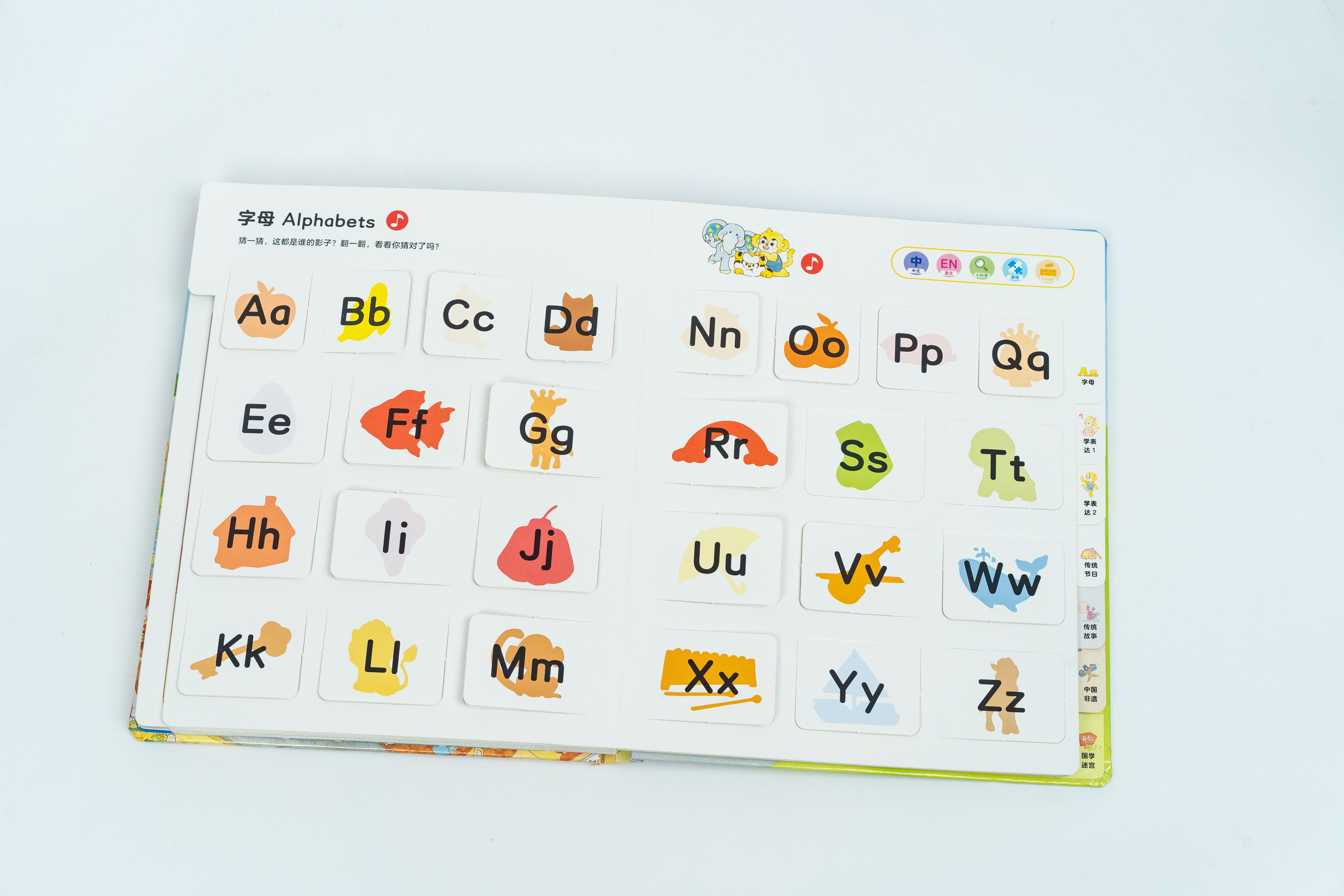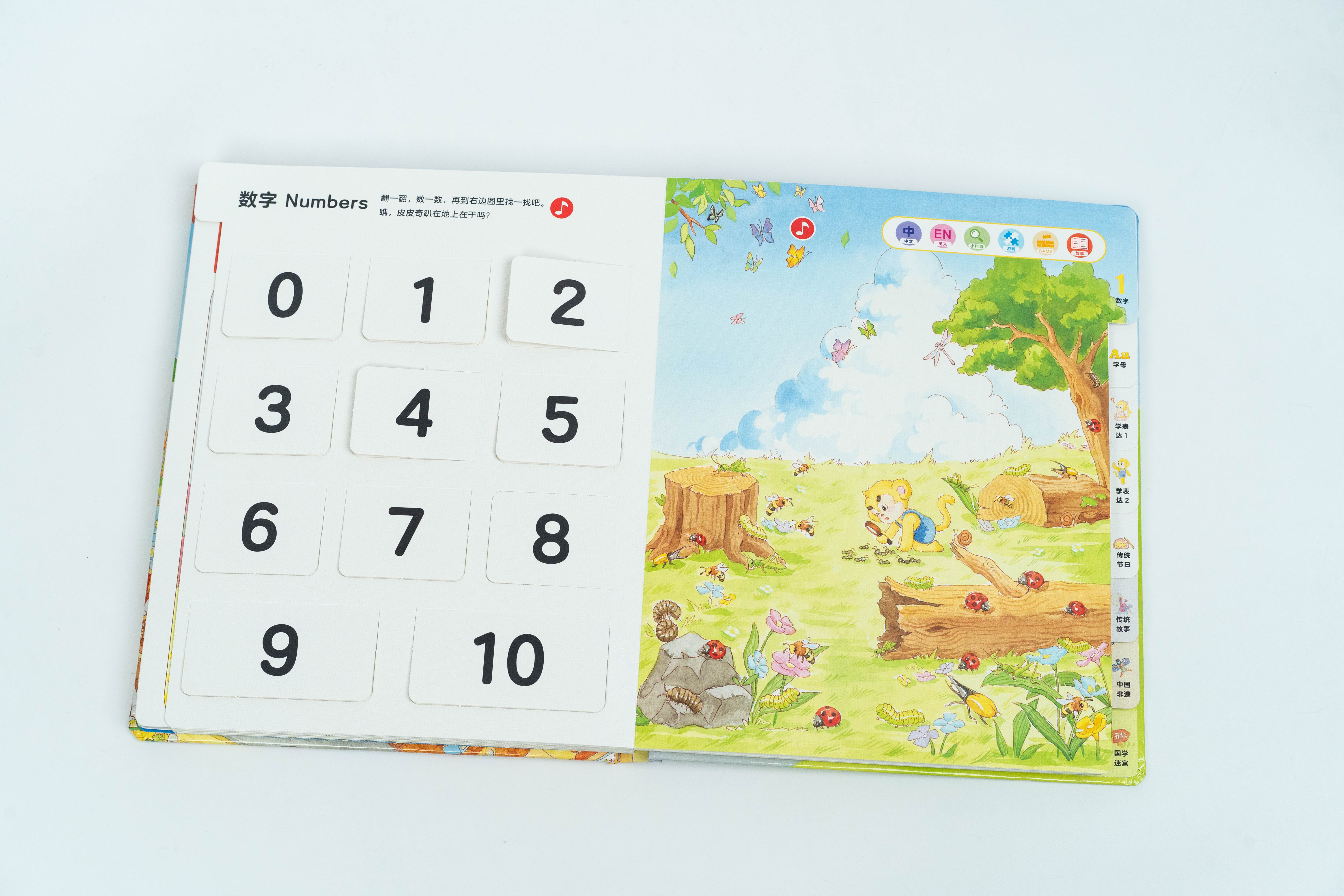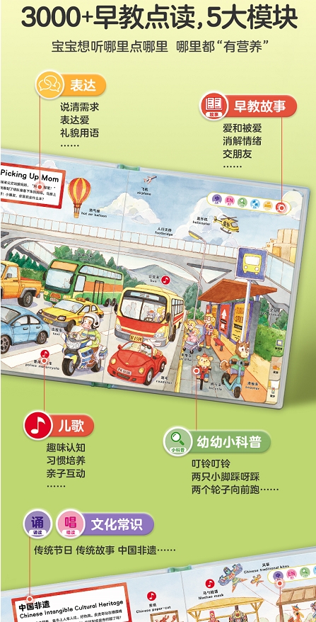 我们点读模块包括儿歌、早教故事、幼幼小科普、游戏、国学,语种有中英双语,对于有粤语需求的家庭,我们还附赠有粤语点读贴纸,撕下来贴到每页的点读标那里,就是一本粤语大百科。