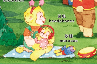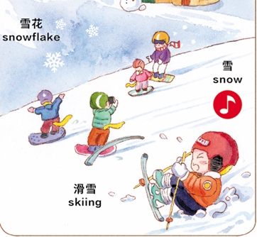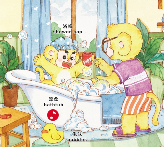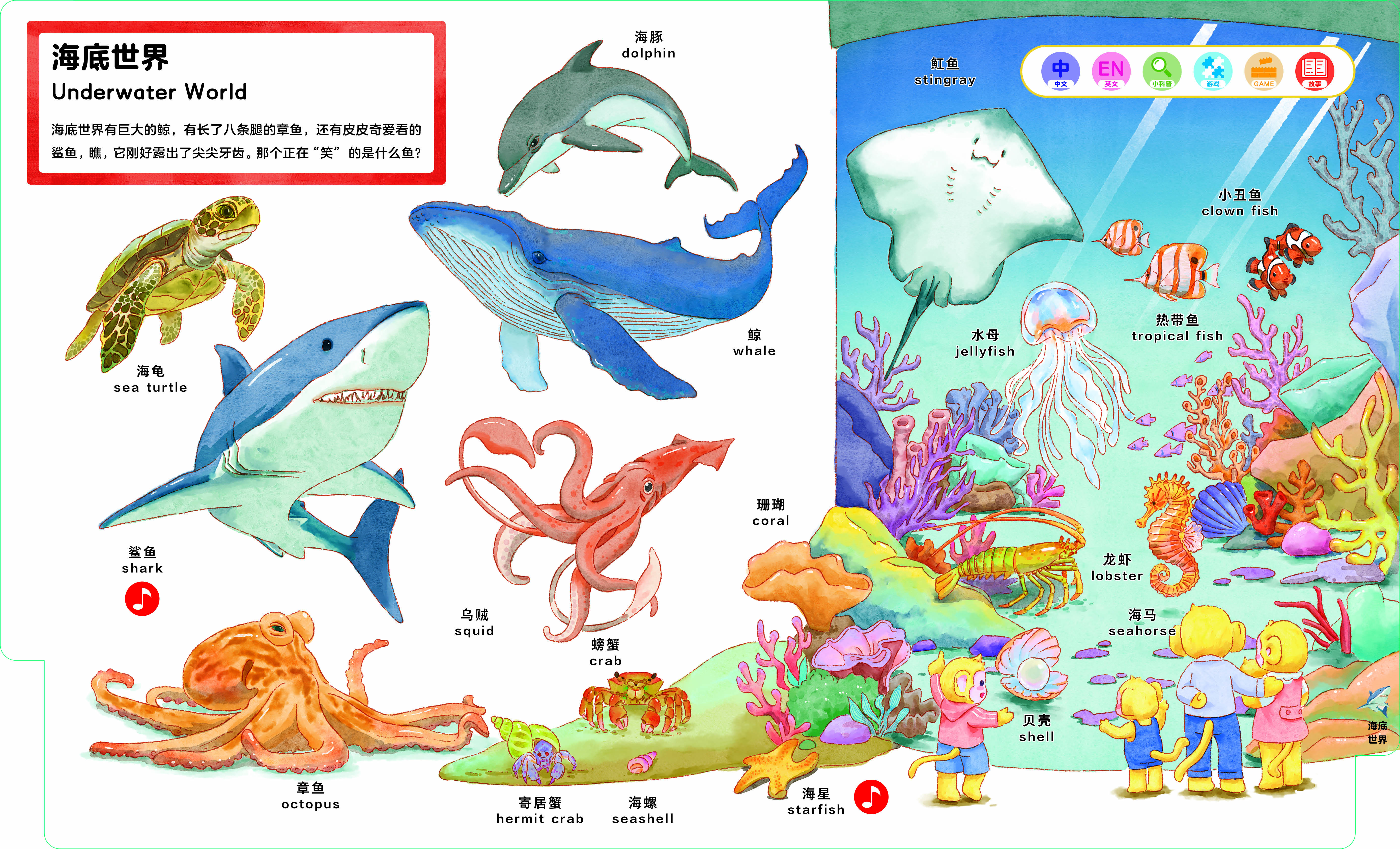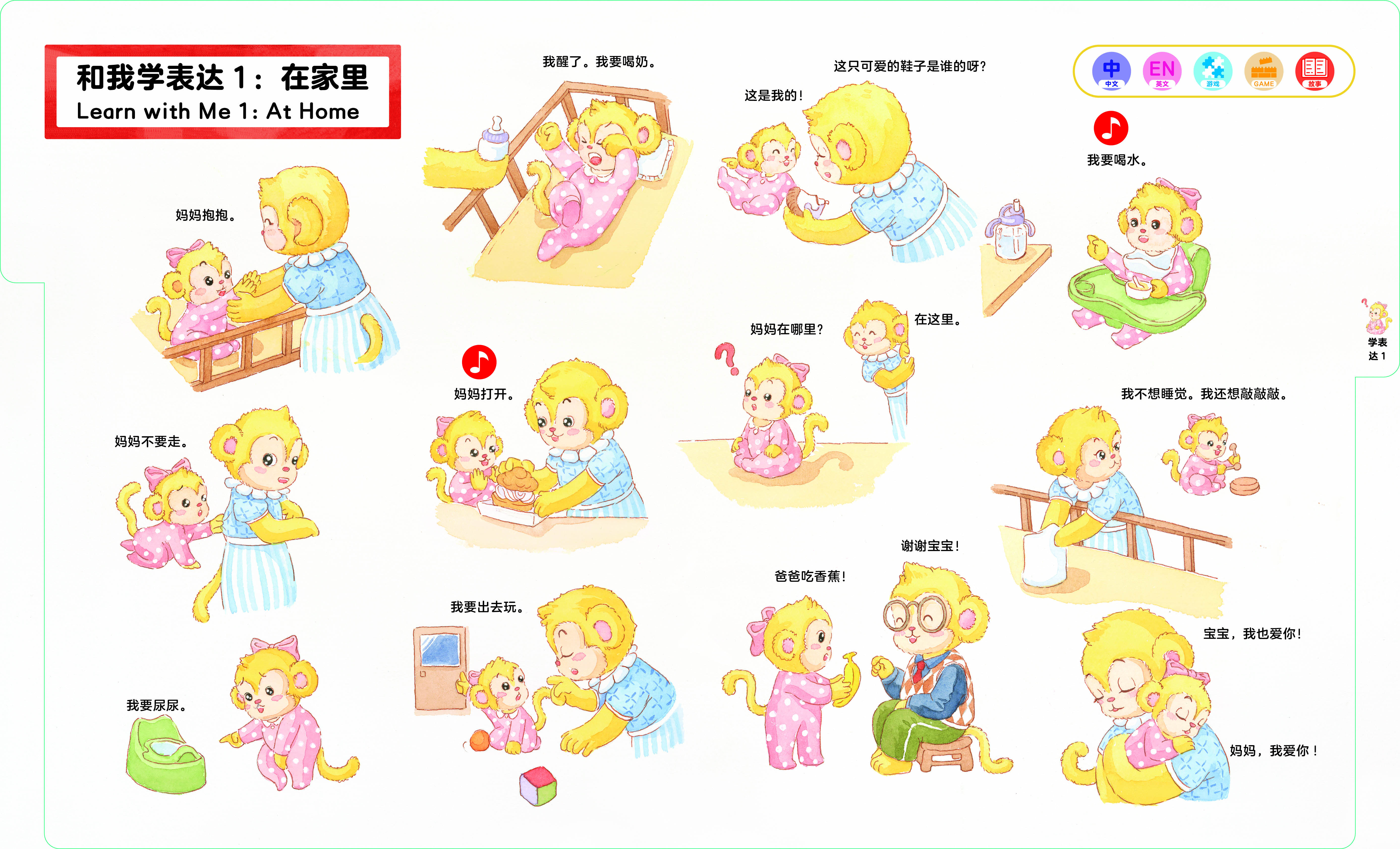 我们点读模块包括儿歌、早教故事、幼幼小科普、游戏、国学,语种有中英双语,对于有粤语需求的家庭,我们还附赠有粤语点读贴纸,撕下来贴到每页的点读标那里,就是一本粤语大百科。