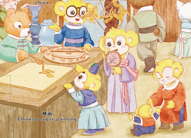 糖画摊上,可以转12生肖转盘,也可以选做好的精美的蝴蝶或者小龙。看,皮皮奇扒着桌子正在和糖画爷爷说个不停,妈妈拿着团扇正在笑呢~