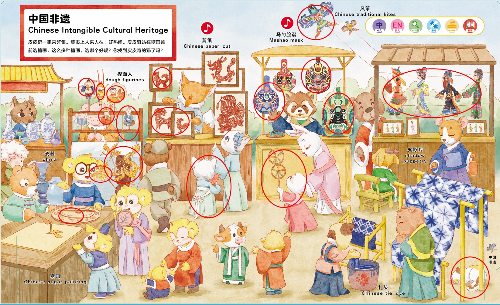 除了大百科都有的基础认知,皮皮奇大百科在传统文化上加了不少量,除了标配的传统节日,我们还有传统故事唱大戏,逛非遗集市和国学手指迷宫。