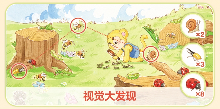 数字是玩视觉大发现游戏的,在右边的画面里可以找到1只蜻蜓 2只蜗牛,3只黄金锹甲,8只小瓢虫……,爱玩找找的宝宝会找得特别有成就感。
