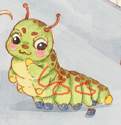 鞋子边走边掉的毛毛虫女士,她身上的绿有深有浅,晕开的水痕把绿黄的过渡衔接了起来,自然又比较柔和,没有色块直接拼接的机械感和突兀感。