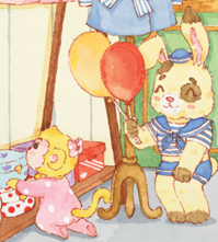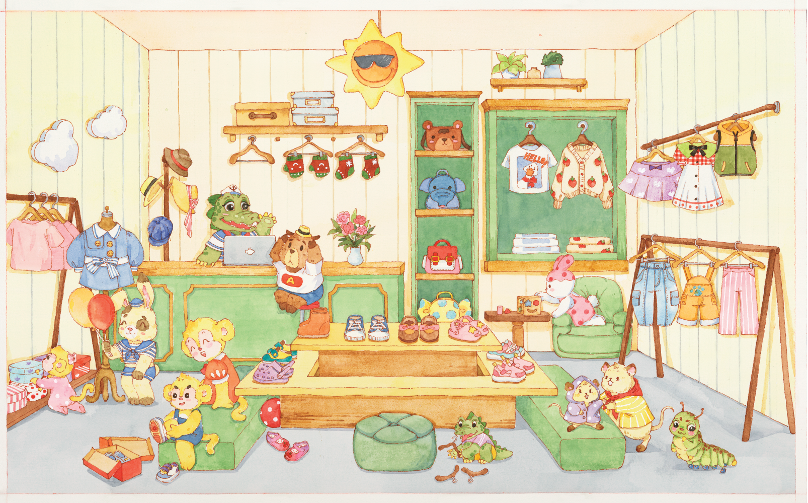 地上的凉鞋还没来得及收拾,店员兔子小姐就忙着拿气球给正在爬来爬去的小猴妹妹;