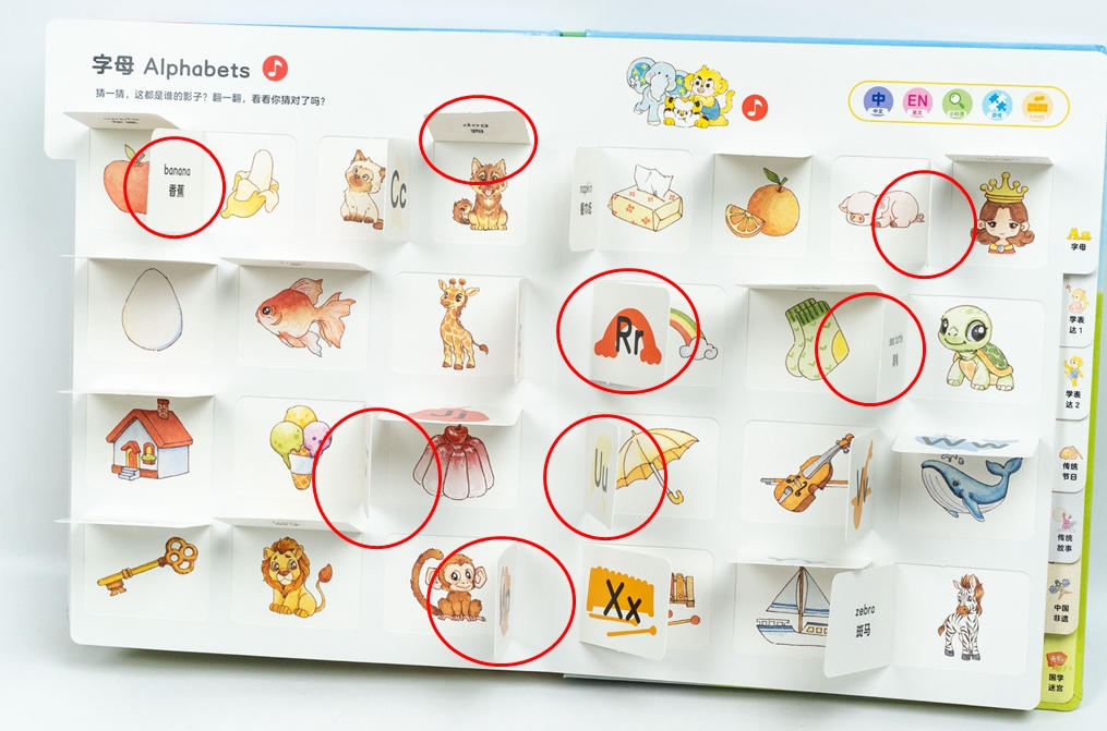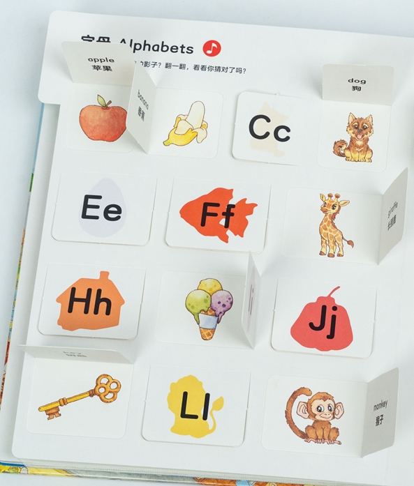 字母这里,翻页外是物品的影子,翻开是对应的物品,宝宝可以玩影子趣配对,影子找找找,可以一个人玩也可以两个三个人一起玩。