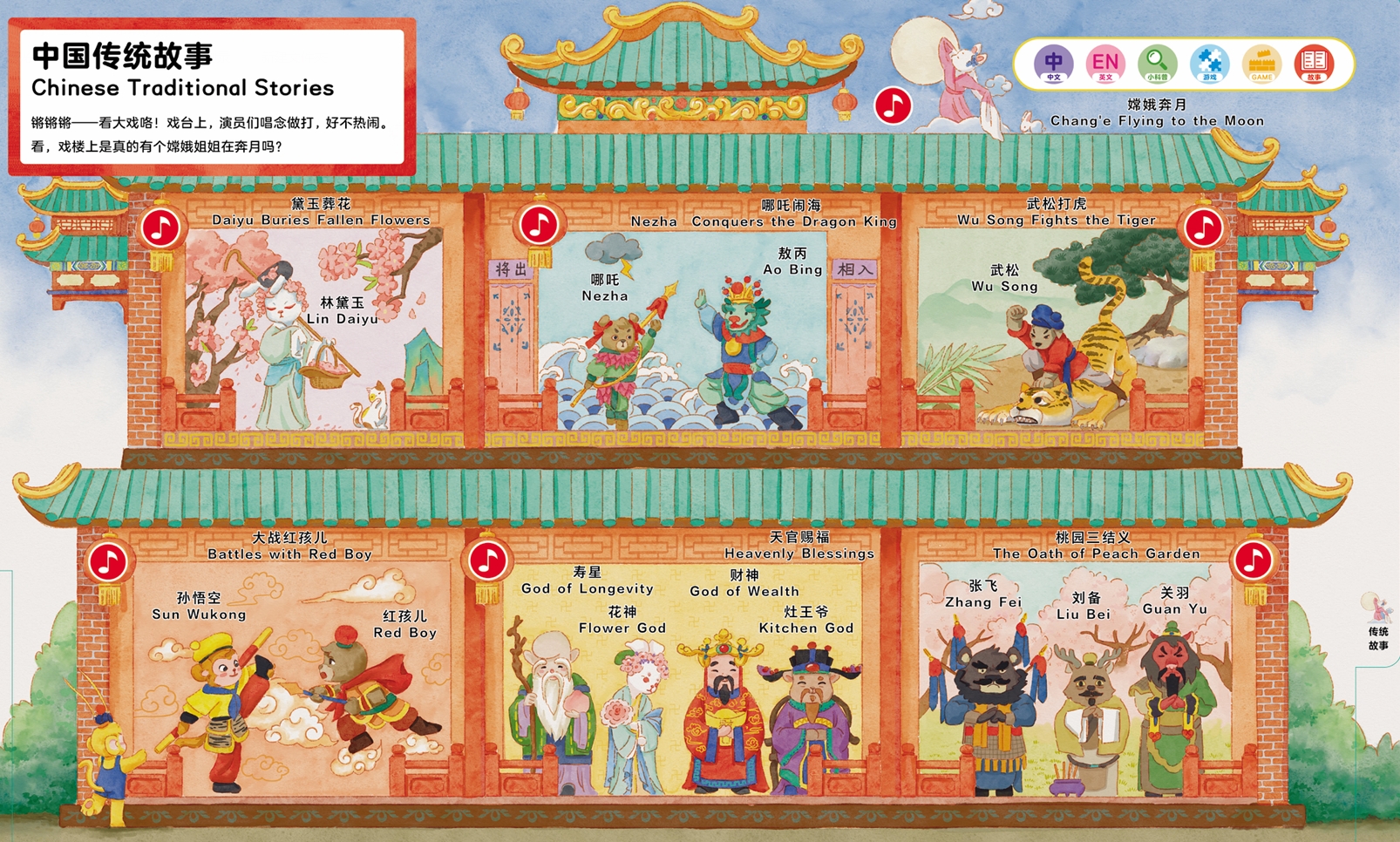 戏楼上的大红灯笼点一点,就能听到新编的流行戏曲唱段,唱词是源于元清的话本,结合了京派大师的演绎,化用现代的流行戏曲元素,宝宝坐在那儿,点一点,小耳朵听着传统文化唱起来,这不就是从小而来的文化自信么。