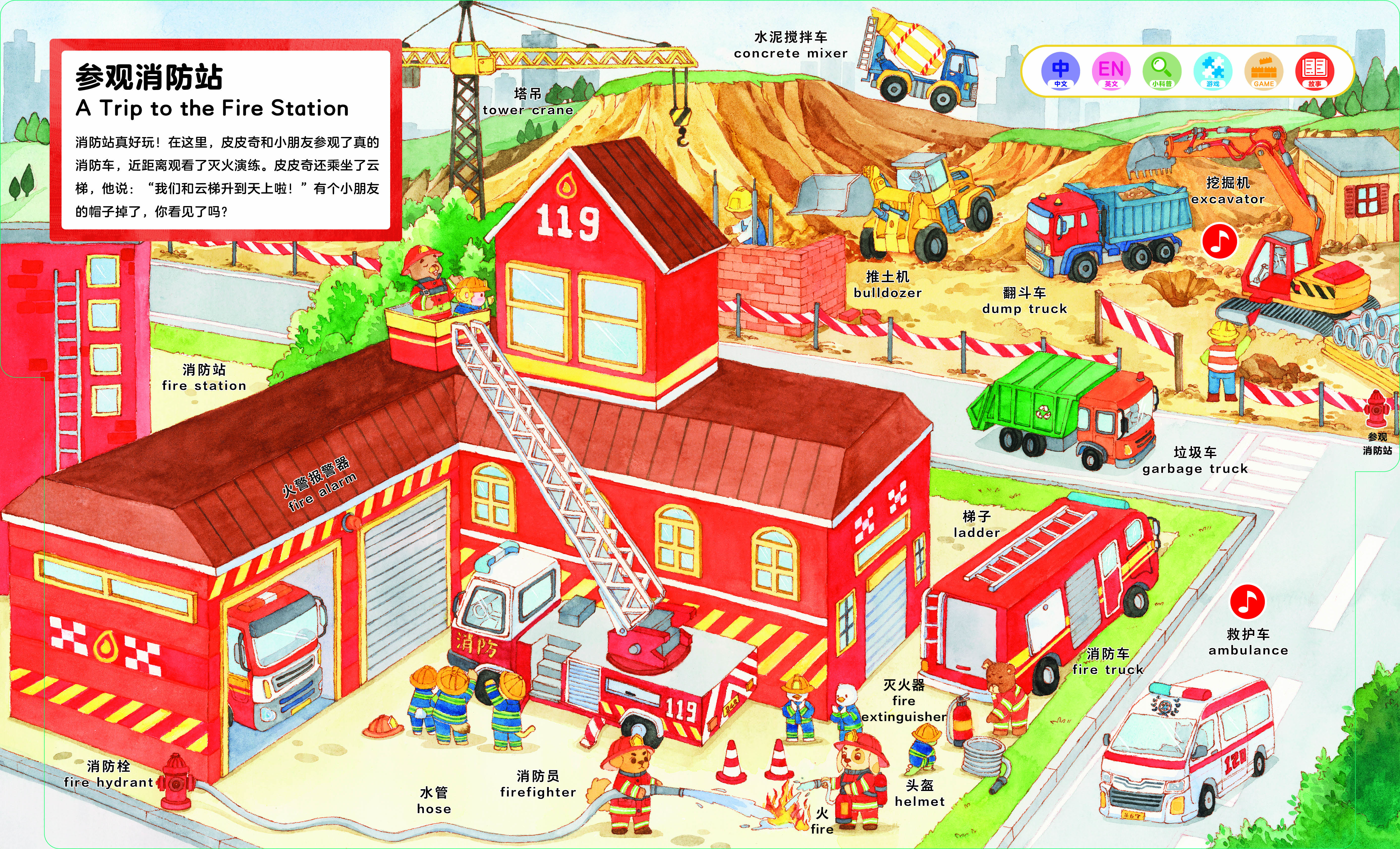 这里有消防站有工地有街道,消防员叔叔在接待一群来参观的小朋友,小不点们都戴着安全帽,有看云梯的,有看灭火的。