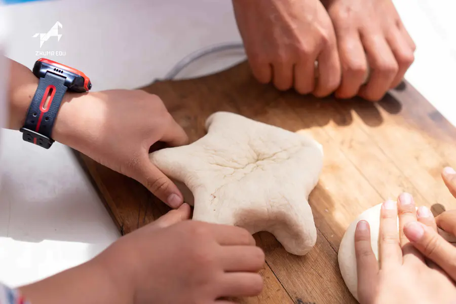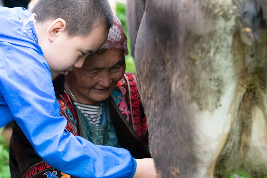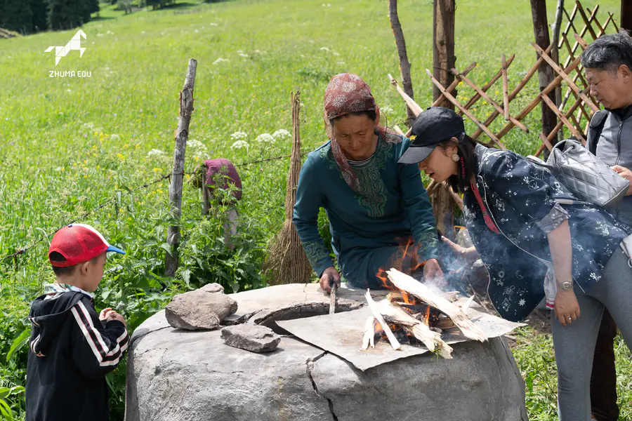清晨,哈萨克原住民将自家的奶牛带到营地,宝贝将和家长一起,挤奶、打馕、制作奶油,吃一顿自己亲手制作的早餐。