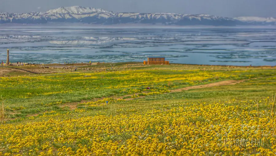 一天里,赛湖的颜色会随着天空的颜色而变化,有人说,赛湖每一分钟都能演绎出一种蓝色,时而呈现晃眼的湛蓝,时而又柔和到近乎透明。不变的,是围绕赛湖的成片草原,和远处天山上的皑皑白雪。