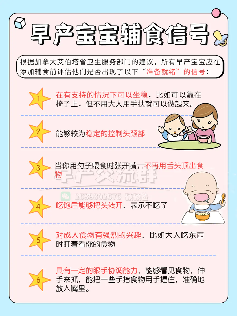 根据加拿大艾伯塔省卫生服务部门的建议,所有早产宝宝应在添加辅食前评估他们是否出现了以下“准备就绪”的信号: