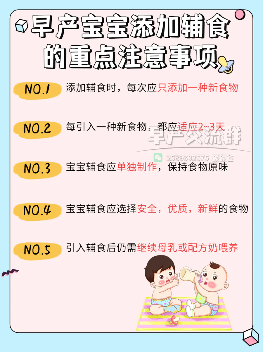 一般推荐健康的足月宝宝在4-6月龄开始添加辅食,但早产宝宝由于胃肠道发育相对不成熟,需要适当延迟辅食引入时间。