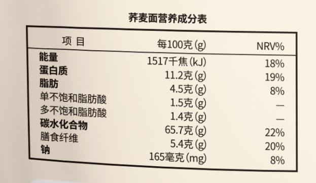 【配料】(面)荞麦粉、水、燕麦粉、糯米粉(2%)、食用盐