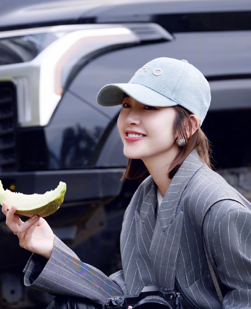 唐艺昕非常时髦帅气的一身穿搭,灰色条纹西装,搭配了一对白色大珍珠耳钉,综合了整体酷帅的风格,带一点复古优雅感