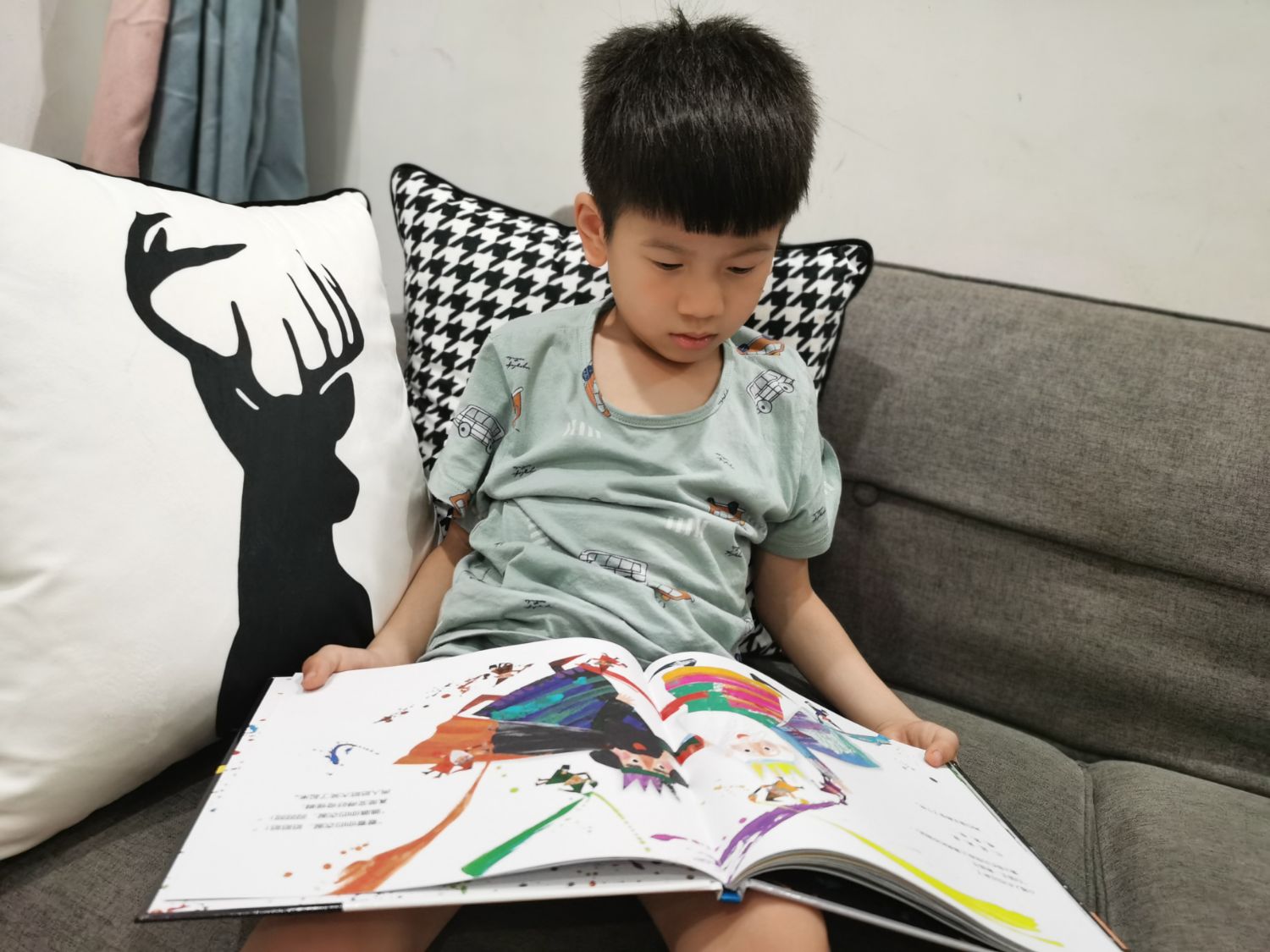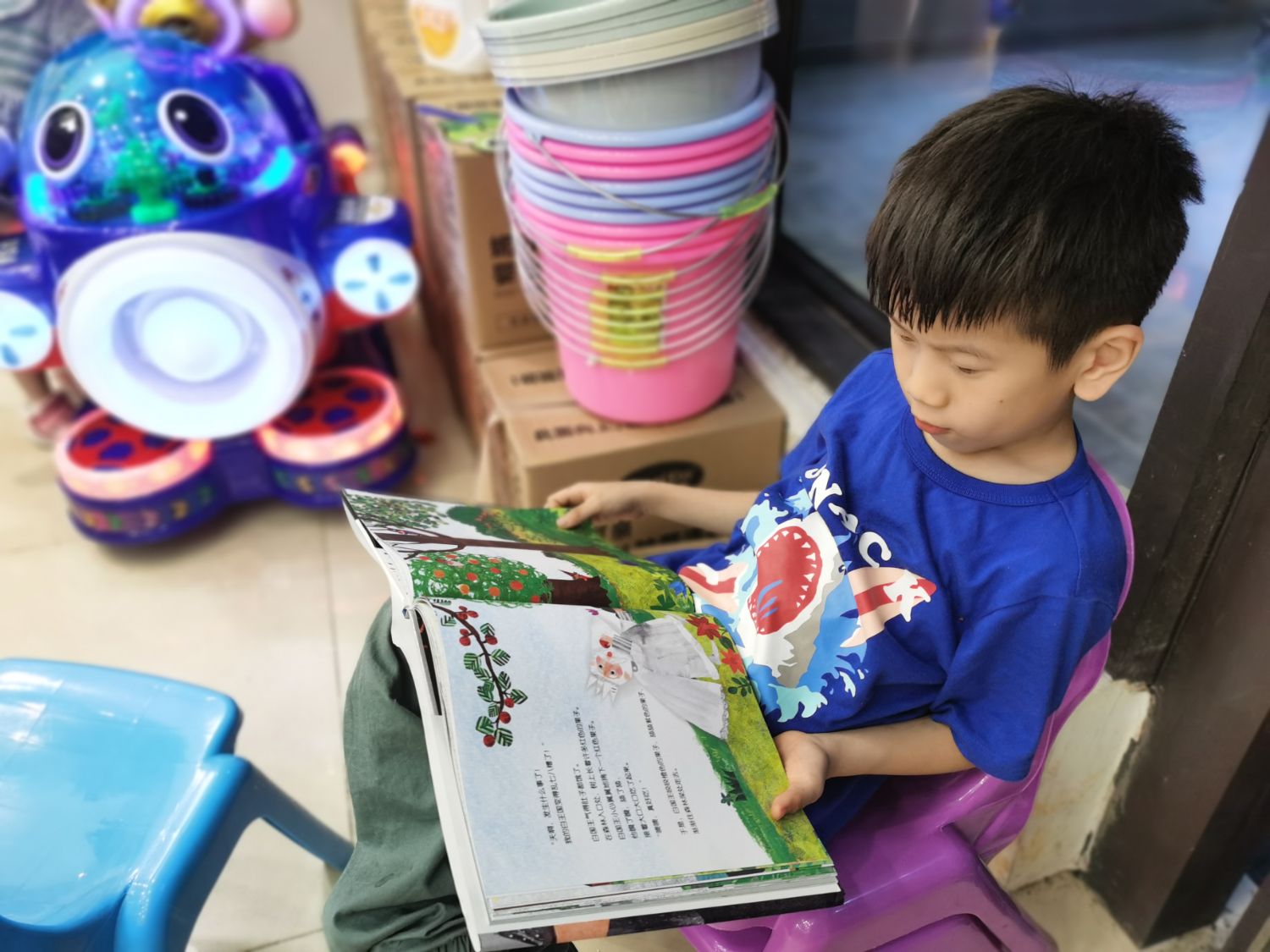 今天哥哥拿着这本书晃悠了楼下整条街,去到每一家店都要坐下来大声读这个故事,他说要举办一场行走中的故事会,他说自己就是小矮人,去到哪里,哪里就会变成色彩缤纷的世界,他说自己不喜欢白王国和黑王国,这样太单调了,只有彩色的王国才能让我们看到世界有多美好。