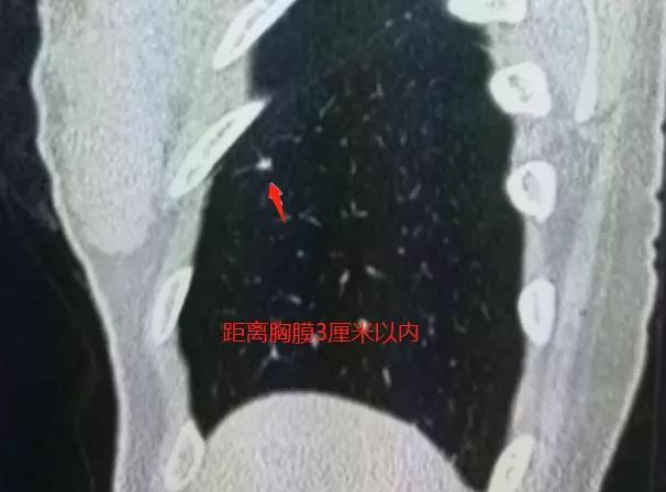 从CT片上可以看到,这个小结节位于她右肺下叶胸膜下,大约5毫米,形态不规则,边缘有小条索影。