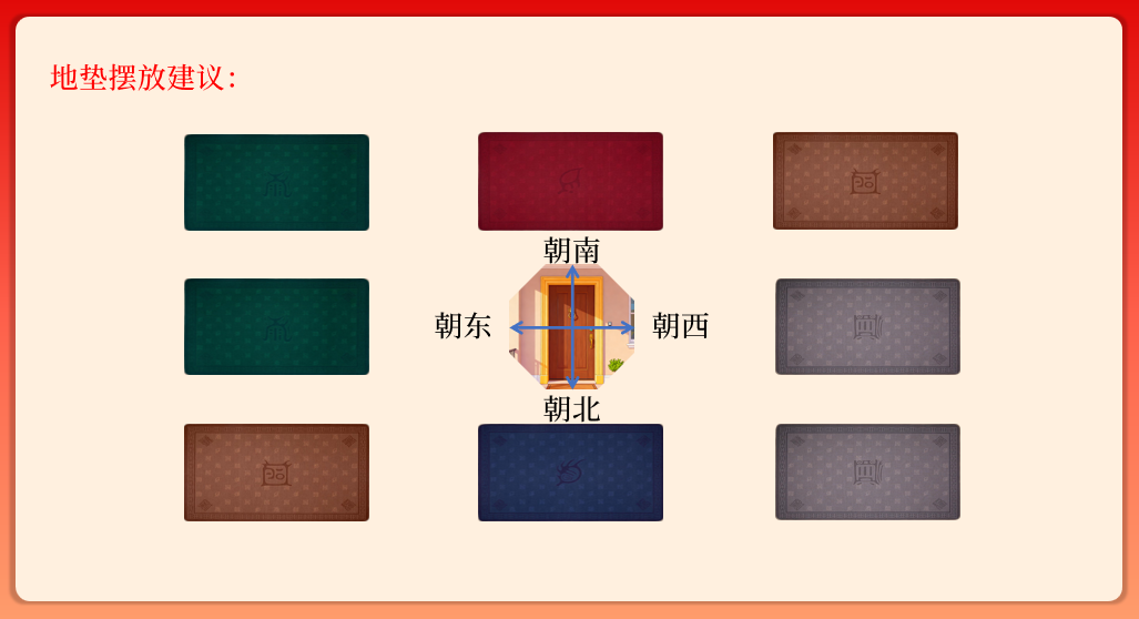 以上是开运门垫更换的讲究。若您春节期间想为家门搭配五行地垫,可参照以下示意图,按方位对应选择。